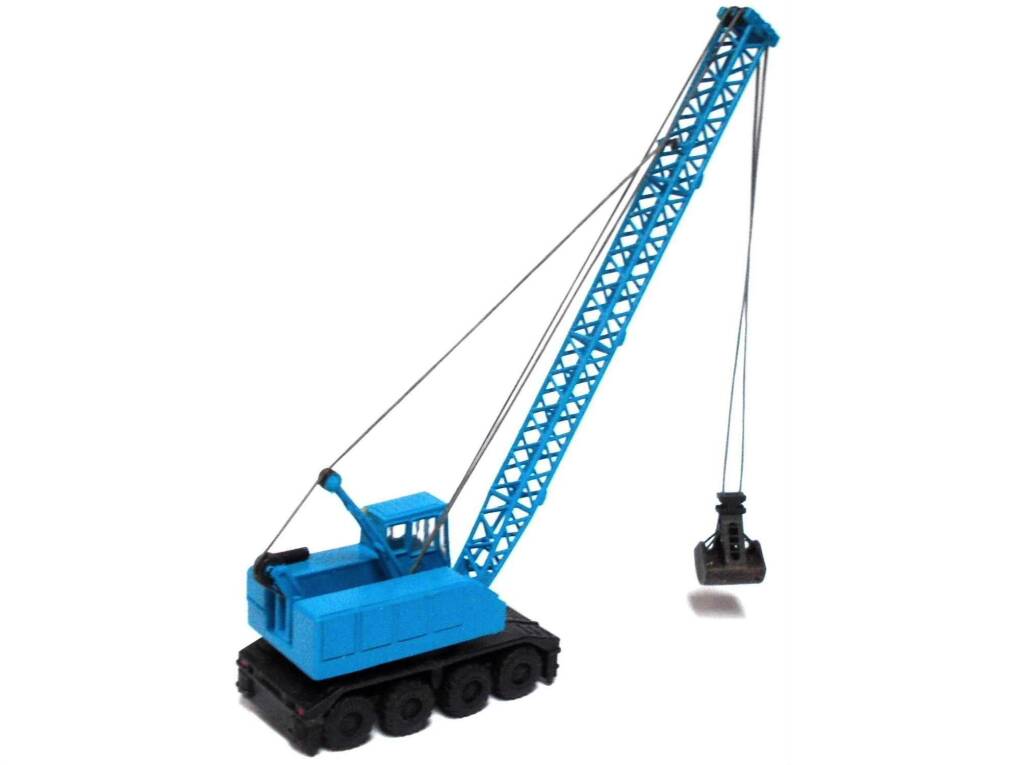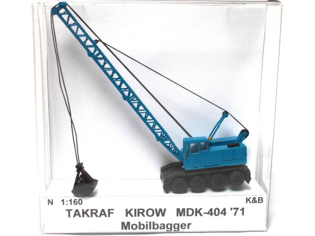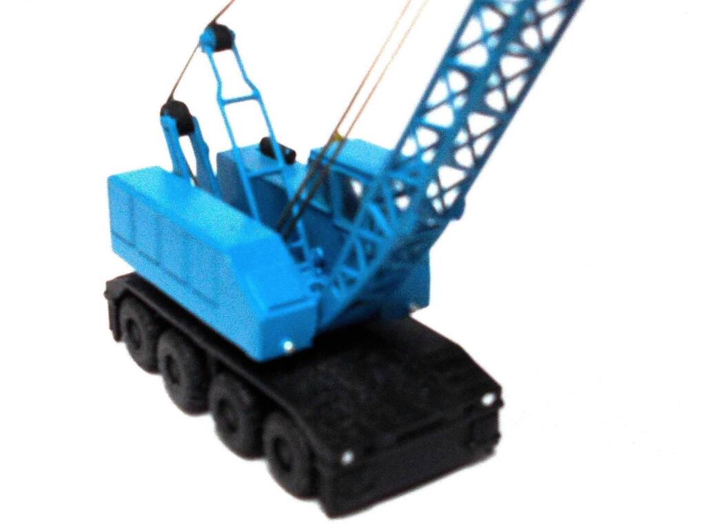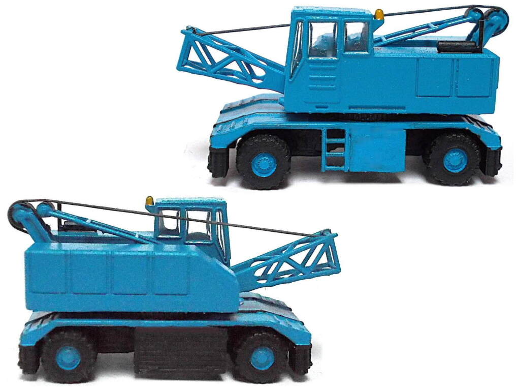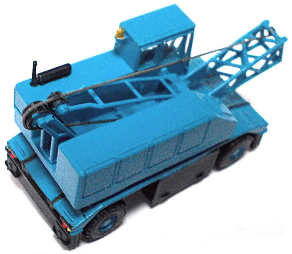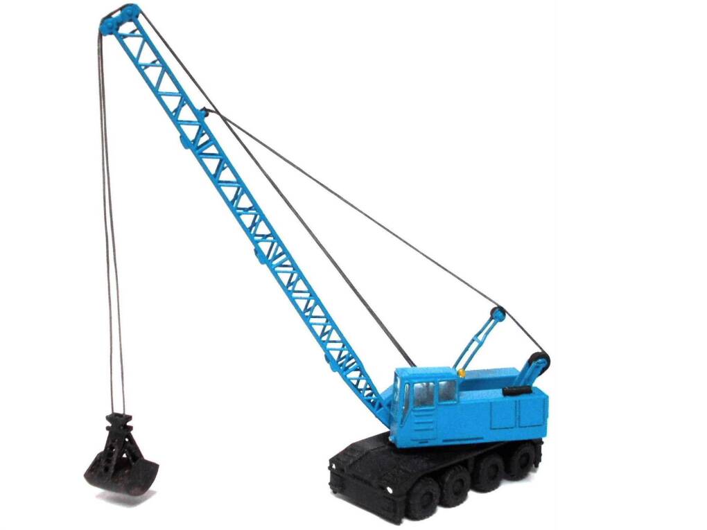 Das Modell wurde aus zwei Kleinserien- 3D-Druck- Bausätzen fertig gebaut, mit Airbrush neu lackiert, farblich in Details verbessert und bekam Fensterscheiben aus Micro Kristal Klear. Der Baggergreifer ist eine Extra- Anfertigung von GeePlast. Der Oberwagen ist frei beweglich.