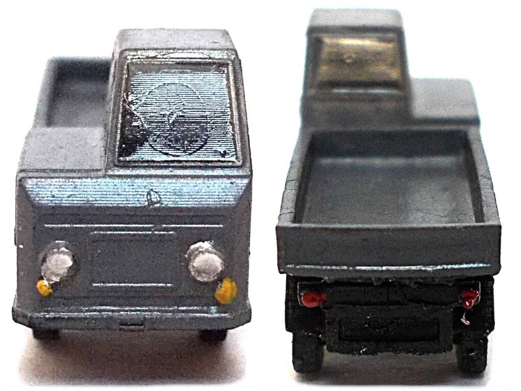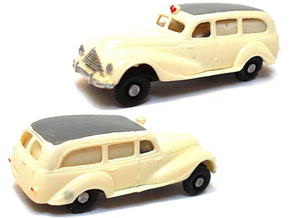 Das Modell wurde aus einem Kleinserien- 3D-Druck- Bausatz fertig gebaut, mit Airbrush neu lackiert, farblich in Details verbessert, bekam Fensterscheiben aus Micro Kristal Klear und feine geätzte Rückspiegel. Das Modell ist in einer Klarsichtschachtel mit Kartoneinlage sicher verpackt.