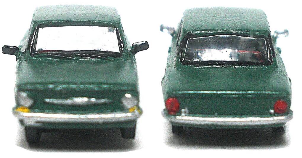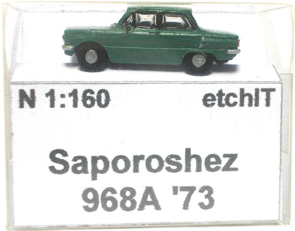 Das Modell wurde aus einem Kleinserien- 3D-Druck- Bausatz fertig gebaut, mit Airbrush neu lackiert, farblich in Details verbessert und bekam Fensterscheiben aus Micro Kristal Klear und Rückspiegel von FKS. Der Saporoshez SAS 968 wurde auch in Belgien als Jalta ZAZ 968, in der Niederlande, Dänemark und Finland als ZAZ Yalta 968 und in Österreich als ZAZ Eliette verkauft. In Belgien wurde er von Scaldia-Volga auch montiert, da aber teilweise mit dem Motor des Renault 8 und hieß dann Jalta 1000. Das Modell ist in einer Klarsichtschachtel mit Kartoneinlage sicher verpackt.