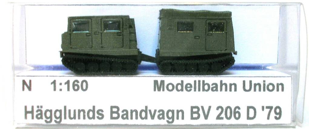 Modellbahn Union N-M00486 Maßstab 1:160 neuwertiges Modell: Hägglunds Bandvagn BV 206 D '79 Einsetzbar auf der Modellbahn ab Epoche IV Das Modell wurde aus einem Kleinserien- 3D-Druck- Bausatz fertig gebaut, mit Airbrush neu lackiert, farblich in Details verbessert und bekam Fensterscheiben aus Micro Kristal Klear. Das Modell ist in einer Klarsichtschachtel mit Kartoneinlage sicher verpackt. 15,00 €