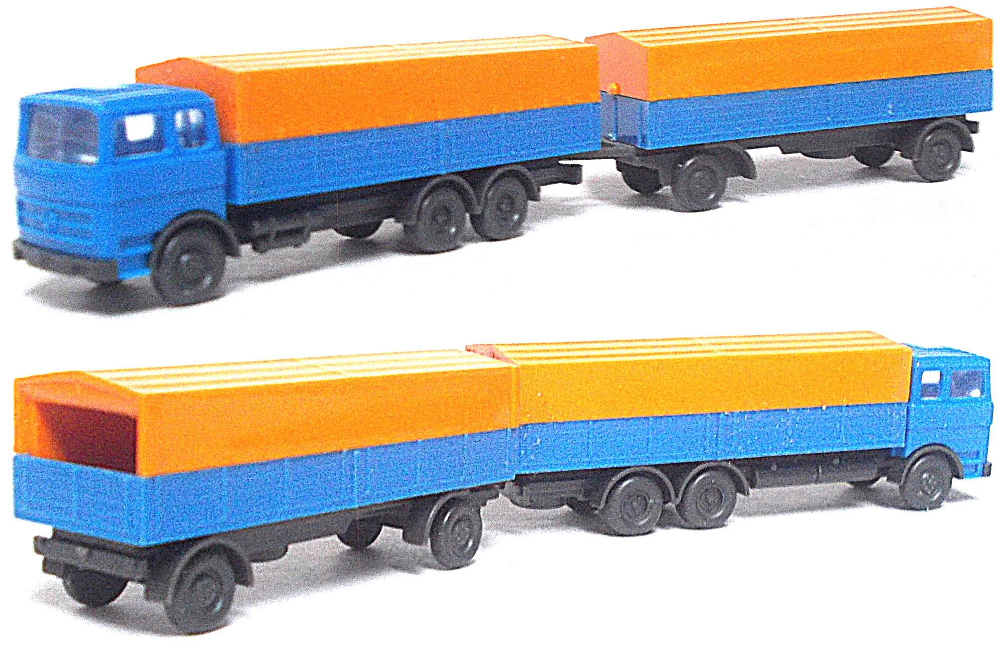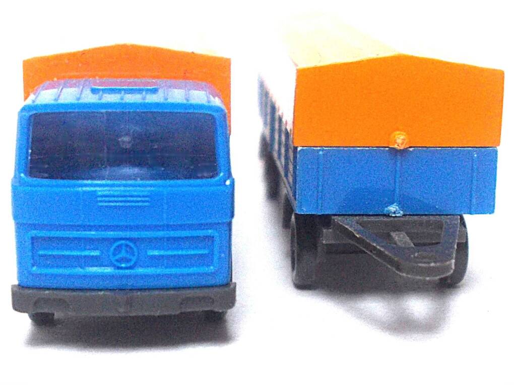 Der Magirus wurde aus Teilen von Modellbahn Union und etchIT gebaut, mit Airbrush lackiert, farblich in Details verbessert, bekam Peilstangen und Rückspiegel von FKS und Fensterscheiben aus Micro Kristal Klear. Der Auflieger von Roco wurde am Fahrgestell / an den Kotflügeln umgebaut, mit Airbrush lackiert, farblich in Details verbessert.