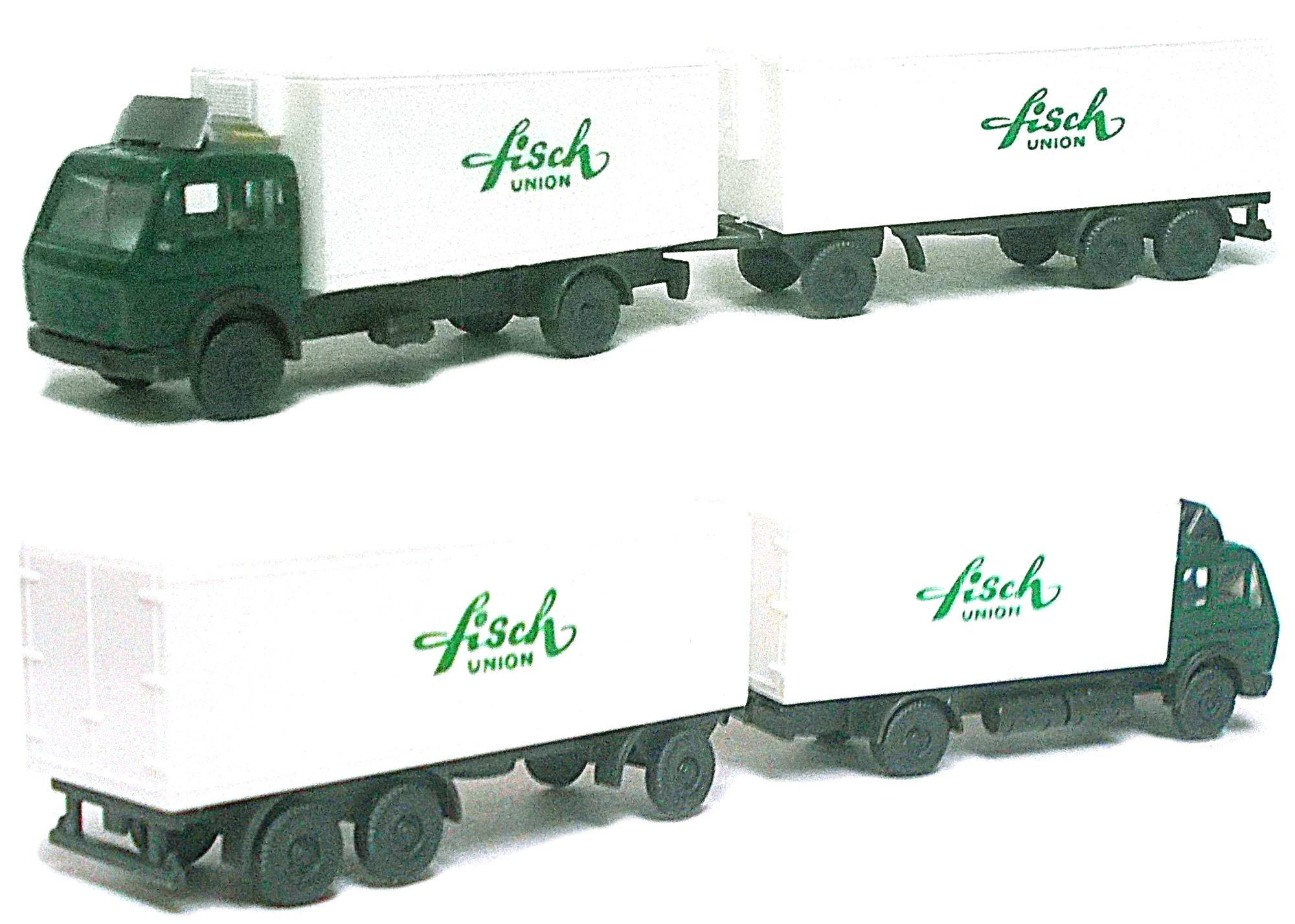 Lemke MiNis / Modellbahn Union Maßstab 1:160 neuwertiges Modell: Der MAN wurde aus einer Sattelzugmaschine durch trennen des Rahmens und einsetzen neuer Teile des Rahmens umgebaut. Er bekam feine geätzte Rückspiegel von FKS und den seitlichen Unterfahrschutz durch Eigenbau. Der Wechselkoffer- Aufbau wurde an das neue Fahrgestell angepasst. Das Modell wurde teilweise mit Airbrush neu lackiert und farblich in Details verbessert. Einsetzbar auf der Modellbahn ab Epoche IV Das Modell ist in einer Klarsichtschachtel mit Kartoneinlage sicher verpackt.